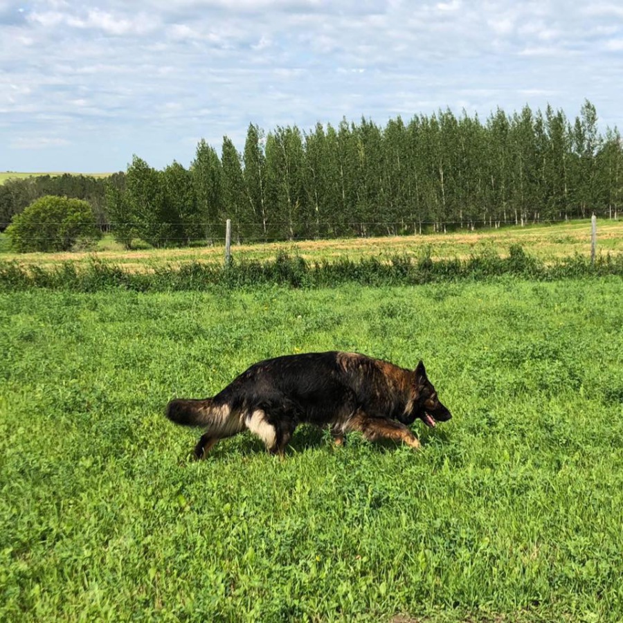Jetta came to us a 4 month old pup. She was always a laid back, easy going girl. She produced many wonderful pups and was always wanting to mother the litters of pups that were not hers. She was a super awesome family dog. Loved, loved, LOVED to snuggle and be cuddled. Love to go from bed to bed of our children at night. When a semi-retired couple who lived on a secluded acreage, with grandchildren who visited often asked if we happened to have a older dog, we knew that this would be a perfect home for our girl. Within days she had made herself at home, like she had been there for years.